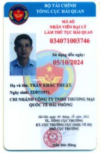 ĐẠI LÝ HẢI QUAN được Bộ tài Chính- Tổng Cục Hải Quan Việt Nam cấp mã số NHÂN VIÊN ĐẠI LÝ LÀM THỦ TỤC HẢI QUAN .